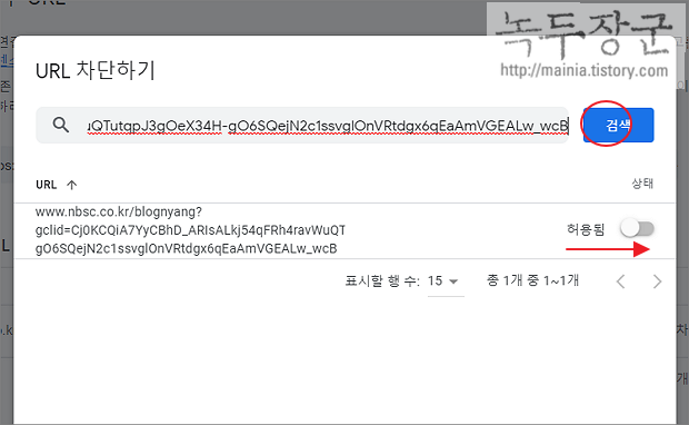 ▼ 복사한 URL 을 입력하고 검색 버튼을 누르면 화면 아래에 결과가 나타납니다. 아무것도 나타나지 않는다면 주소가 잘못된 것입니다. 검색 결과에서 허용됨을 차단으로 변경합니다.