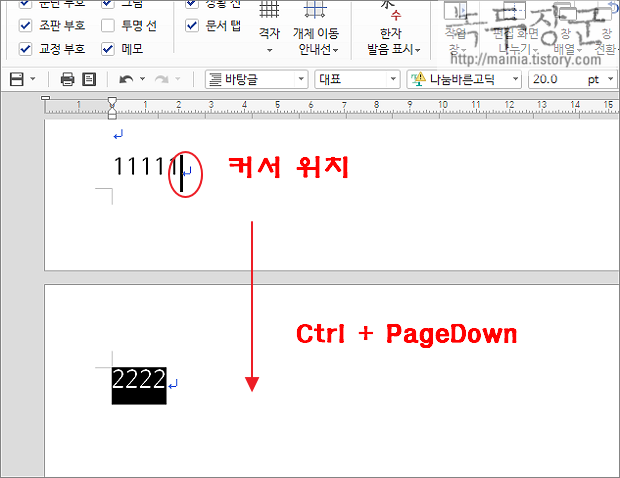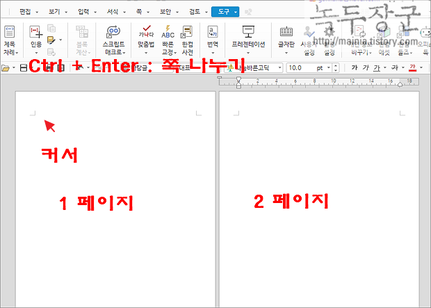 ▼ 페이지의 커서 위치에서 단축키 Ctrl + Enter 누르면 다음 페이지가 생성됩니다. 항상 커서 있는 페이지에서 바로 다음 페이지가 추가됩니다. 단축키는 쪽 나누기 메뉴를 실행한 것입니다.