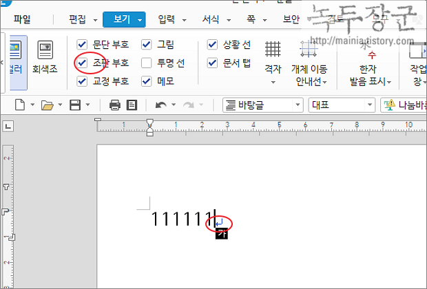▼ 페이지가 삭제되는 원리를 설명하겠습니다. 조판부호 중 줄 바꿈 표시가 없어지면 페이지가 삭제됩니다. 조판부호가 무엇이냐? 사용자가 내리는 명령을 표시한 기호입니다. 평소에는 화면이 지저분해서 숨겨놓습니다. 다시 화면에 나타내기 위해서는 보기 > 조판 부호를 체크해야 합니다. 아래 그림의 조판부호는 줄 바꿈 표시 입니다. 이렇게 생긴 줄 바꿈 표시를 화면에서 사라지면 페이지도 없어지는 것입니다.