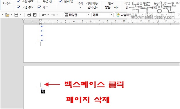 ▼ 조판부호 없이 설명하면 이해하기 어렵기 때문에 표시하고 시작하겠습니다. 위에서 이야기한 것처럼 페이지에서 줄 바꿈 표시가 없어지면 삭제됩니다. 줄 바꿈 표시는 백스페이스 키나 Delete 키로 영역을 삭제하면 왼쪽으로 이동합니다. 하나의 페이지에 데이터를 모두 삭제하고 마지막에 백스페이스 키를 누르면 상위 페이지로 이동하고 이전 페이지는 삭제됩니다.