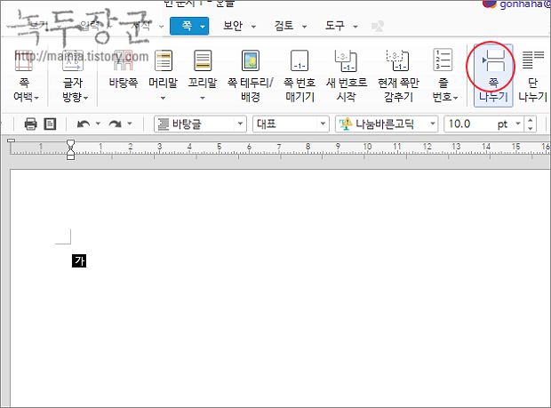▼ 메뉴에서는 쪽 탭 > 쪽 나누기를 통해 페이지를 추가할 수 있습니다.