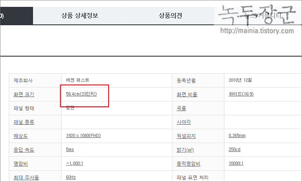 ▼ 검색 결과에서 홈페이지로 이동해 제품 사양 정보를 확인합니다. 각 항목에서 화면 크기로 가면 몇 인치인지 확인할 수 있습니다.
