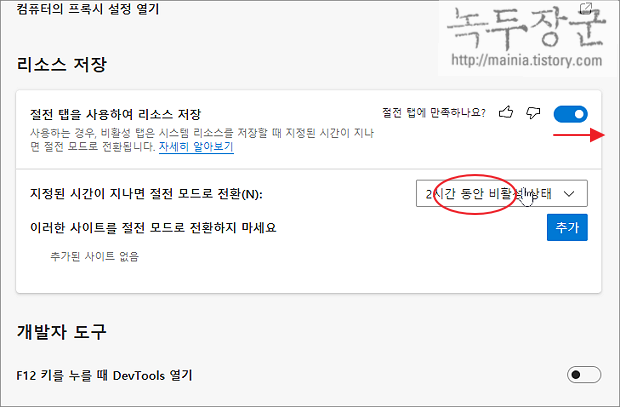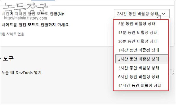 ▼ 절전 탭 소개에도 나와 있지만 기본 2시간 동안 사용하지 않은 탭은 절전모드로 전환이 되며, 리소스를 절약합니다.