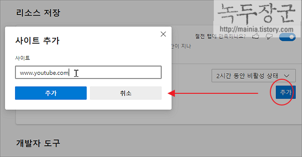 ▼ 절전 모드를 사용하지만 특정 사이트는 제외시킬 수 있습니다. 예를 들어 유튜브에서 음악을 듣고 있는 경우 절전 모드 전환으로 중지되는 것을 막을 수 있겠죠. 추가 버튼을 눌러 사이트 URL 을 입력합니다.