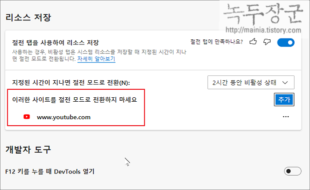 ▼ 그림과 같이 절전 모드에서 제외하고 싶은 사이트는 "이러한 사이트를 절전 모드로 전환하지 마세요" 에 추가합니다.