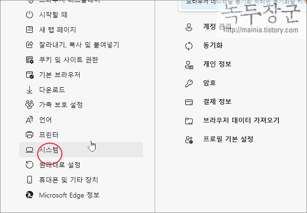 ▼ 다음으로 설정 페이지에서 왼쪽 사이드에 시스템 메뉴를 클릭합니다.