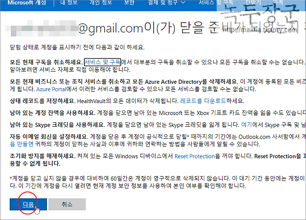 ▼ 계정 삭제를 위해 다음 페이지로 이동해서 검토 여부 항목들을 모두 체크합니다.