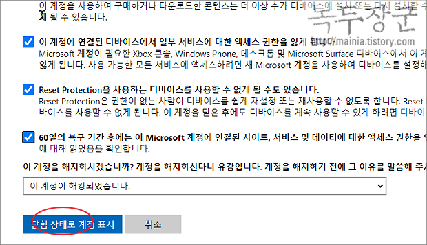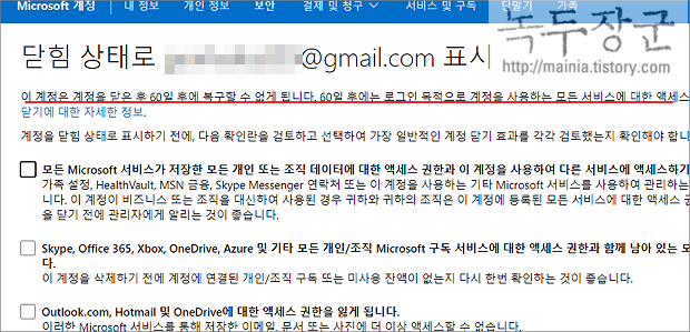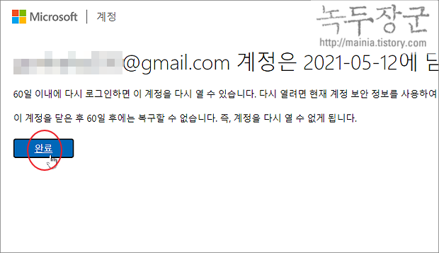▼ 다음 페이지에서 완료 버튼을 누르면 최종적으로 계정이 닫히게 됩니다. 이제 60일 이후에는 계정을 영구 삭제합니다.