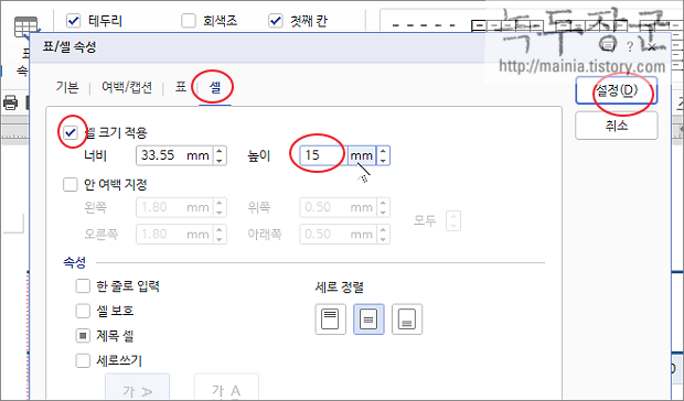 ▼ 표/셀 속성 팝업창이 뜨면 셀 탭으로 이동합니다. 셀 속성의 셀 크기 적용 옵션을 체크해서 활성화합니다. 그리고 일정하게 맞추고 싶은 셀 크기를 입력하고 설정 버튼을 눌러 적용합니다.