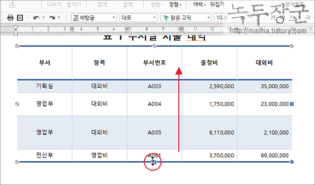 ▼ 마지막으로 마우스를 이용해서 간격을 일정하게 맞추는 방법입니다. 제가 가장 많이 쓰는 방법입니다. 표의 간격을 보면서 조절할 수 있기 때문에 아주 편리합니다. 우선 표를 선택하면 테두리에 조절점이 생깁니다. 일전한 간격을 맞추고 싶은 방향으로 조절점을 이용해서 줄일 수 있을 때까지 옮겨서 최소의 크기로 만듭니다.