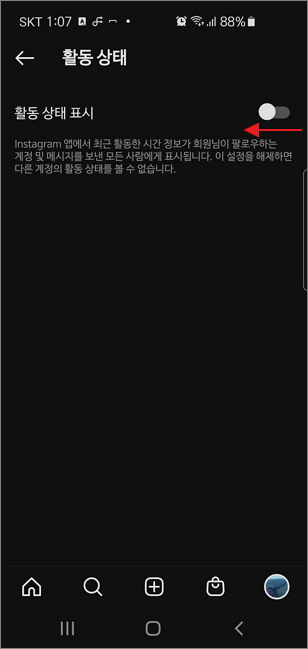 ▼ 활동상태 설정 페이지로 이동하면 상단에 활동 상태 표시 옵션을 사용 안 함으로 변경합니다.