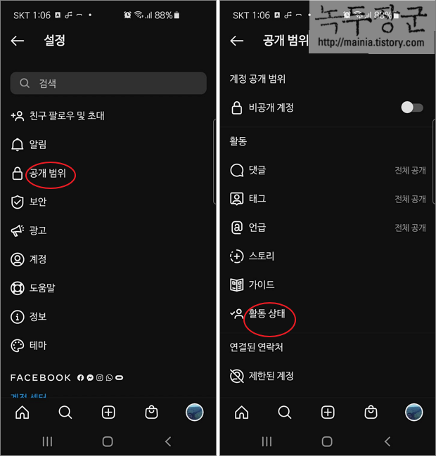 ▼ 설정의 여러 메뉴들 중에서 공개범위 > 활동상대 를 선택합니다.