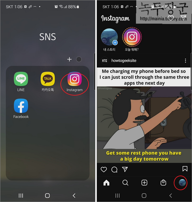 ▼ 먼저 활동 상태 표시를 꺼 보겠습니다. 인스타그램 앱을 실행하고 화면 하단에 계정 탭을 클릭합니다.