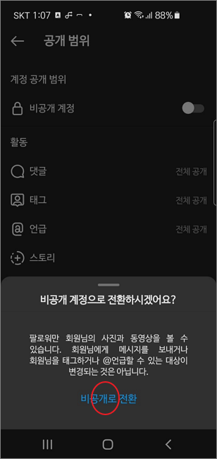 ▼ 비공개 전환하기 전에 한 번 더 묻는 화면이 나타납니다. 팝업창에서 비공개로 전환 버튼을 누르면 설명에도 나와 있듯이 팔로워한 사람을 제외하고 사진과 동영상을 볼 수 없게 됩니다.