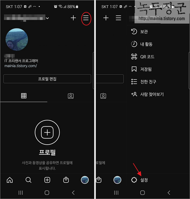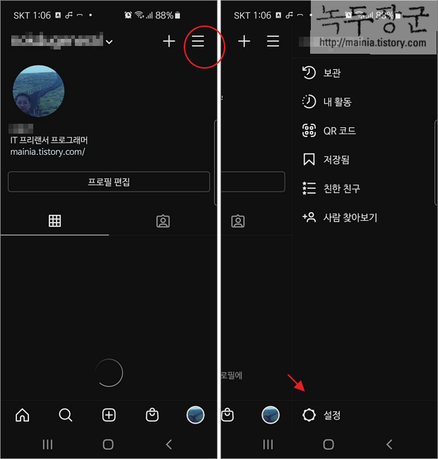 ▼ 다음은 팔로워한 사람을 제외하고 이미지나 동영상을 볼 수 없도록 계정을 비공개로 전환하는 방법입니다. 다시 계정 화면으로 이동해서 더보기 > 설정 메뉴를 클릭합니다.