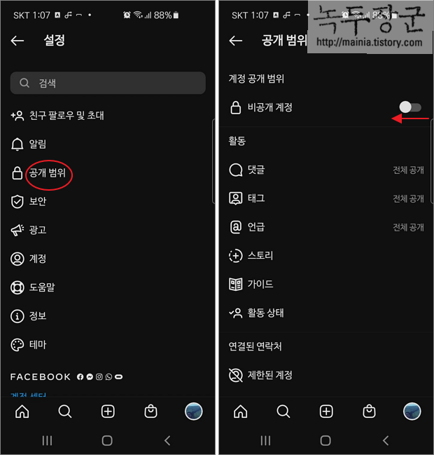 ▼ 설정의 메뉴 목록에서 공개범위를 선택합니다. 공개범위 설정화면 상단에 비공개 계정 전환 옵션이 있습니다. 비공개 계정 전환옵션을 사용으로 변경합니다.