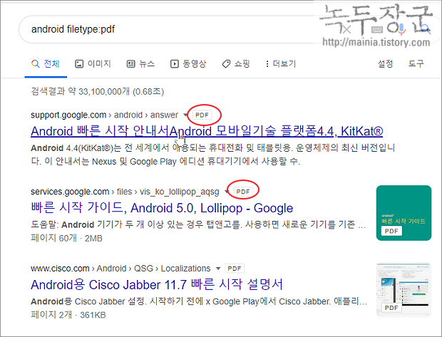 ▼ 검색 결과는 다음과 같습니다. 제목 바로 위에 보시면 어떤 파일 형식을 검색했는지 알 수 있습니다. PDF 표시는 검색 결과 링크를 클릭했을 때 웹페이지 이동이 아닌 PDF 파일을 다운받을 수 있다는 의미입니다.