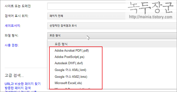 ▼ 고급 검색 페이지에서 파일 형식 항목을 찾습니다. 모든 형식 콤보박스를 클릭하면 목록에 선택가능한 파일 확장자 목록이 나타납니다.