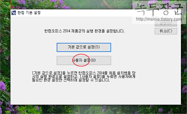 ▼ 실행한 한컴 기본 설정 화면에서 두 개의 버튼 중 아래에 있는 사용자 설정을 클릭합니다.