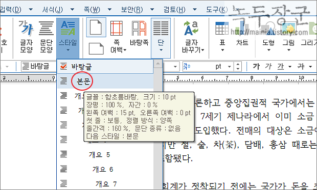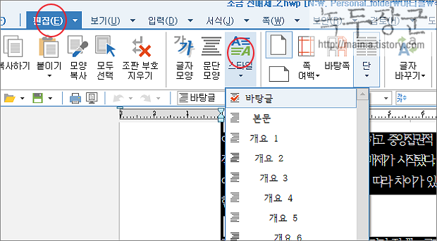 ▼ 문제가 된 단락을 모두 선택한 후 편집 탭 > 스타일로 갑니다. 스타일 목록에는 기본으로 제공되는 것들입니다.
