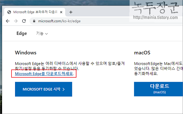 ▼ 화면 아래로 내려가서 Windows 항목으로 갑니다. 그리고 Microsoft Edge 를 다운로드하세요. 링크를 클릭해서 프로그램을 다운받습니다.