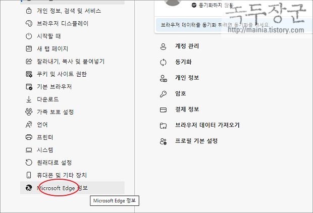 ▼ 왼쪽 사이드 메뉴 목록에서 제일 아래에 있는 Microsoft Edge 정보를 선택합니다.