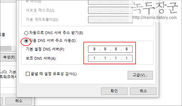 ▼ 인터넷 프로토콜 버전 4(TCP/IPv4) 설정 창에 "다음 DNS 서버 주소 사용" 을 체크하고 기본 설정 DNS 와 보조 DNS 서버 주소를 입력합니다.