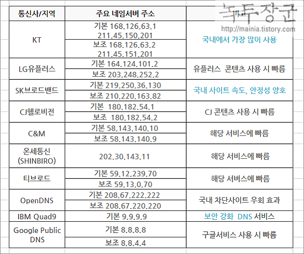 | ◎ 국내 주요 DNS 표 |