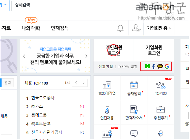 ▼ 메인 페이지에 접속해서 로그인을 합니다. 소셜 아이디로 가입한 경우 아래 해당 아이콘을 클릭해서 로그인합니다.