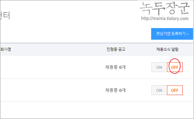 ▼ 두 번째는 해당 기업의 오른쪽 끝에 채용소식 알람을 OFF 으로 변경하는 방법입니다.
