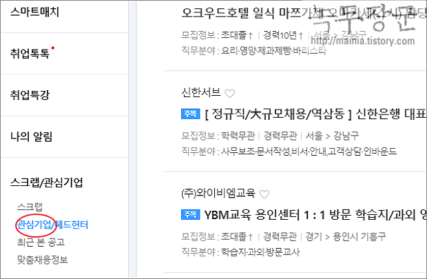 ▼ 또 다른 메일 발송 옵션이 있습니다. 사용자가 등록한 관심기업이 있다면 기본으로 채용소식 알림을 발송합니다. 이제 더 이상 필요 없는 경우 해제합니다. 스크랩/관심기업 > 관심기업/헤드헌터 메뉴를 선택합니다.