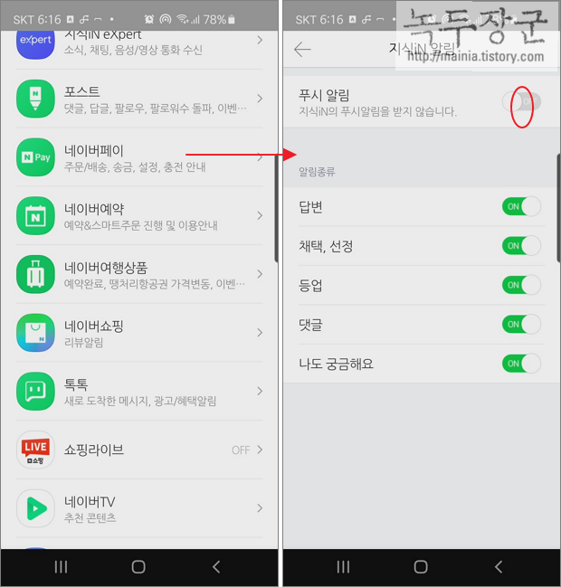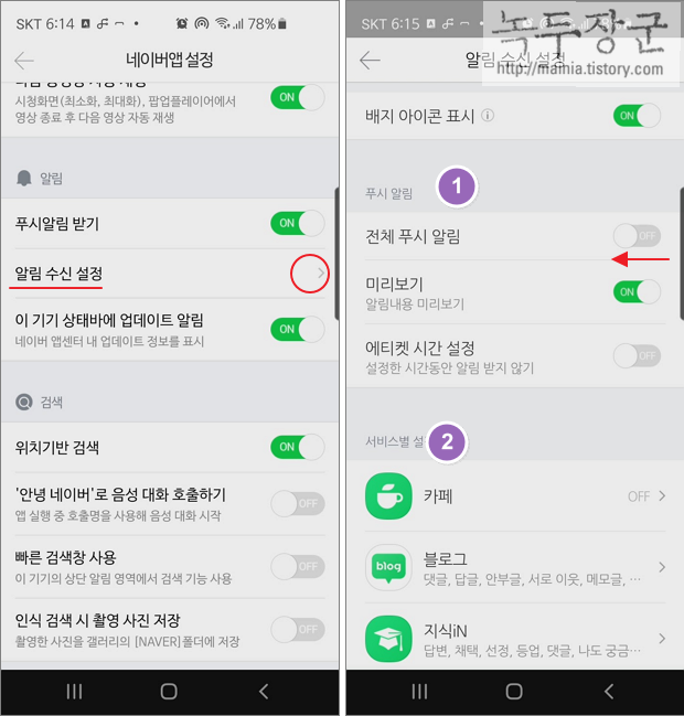 ▼ 화면 아래의 서비스별 설정으로 가서 알림을 해제하고 싶은 서비스를 클릭합니다. 해당 서비스의 알림 설정 화면으로 이동해서 알림 수신 여부를 결정합니다. 상단에 푸시 알림 은 세부 알림 전체를 제어합니다.