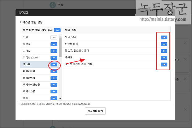 ▼ 네이버 알림 환경 설정 창이 화면이 나타납니다. 화면에는 왼쪽에 알림 항목과 오른쪽에 상세 알림 항목이 나타납니다. 왼쪽 항목을 선택하면 오른쪽 화면에 해당 알림의 상세 목록을 볼 수 있습니다. ON 과 OFF 전환으로 알림 수신 여부를 결정합니다.