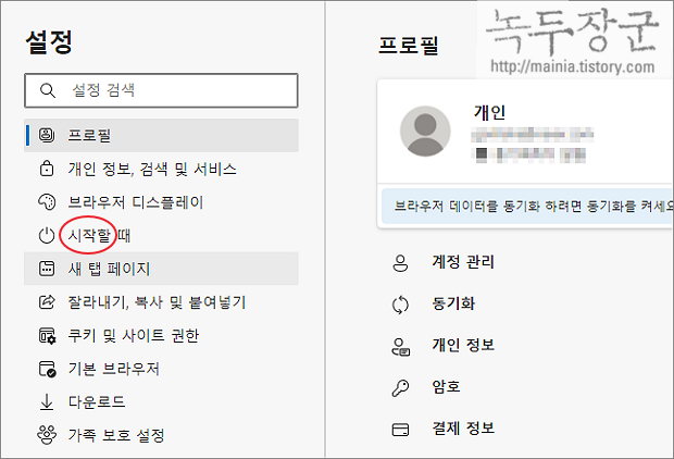 ▼ 엣지 설정 화면으로 이동해서 왼쪽 사이드에 시작할 때 메뉴를 클릭합니다.