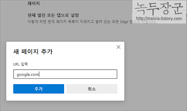 ▼ 화면에 나타난 대화상자에서 새 탭에 띄울 사이트 URL 을 입력하고 추가 버튼을 클릭합니다.