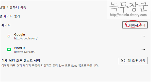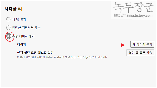 ▼ 시작할 때에는 3가지 선택 옵션이 있습니다. 이 중에서 제일 아래에 있는 특정 페이지 열기 를 선택합니다. 다음은 엣지를 실행했을 때 띄우는 웹페이지를 지정합니다. 오른쪽 끝에 새 페이지 추가 버튼을 클릭합니다.