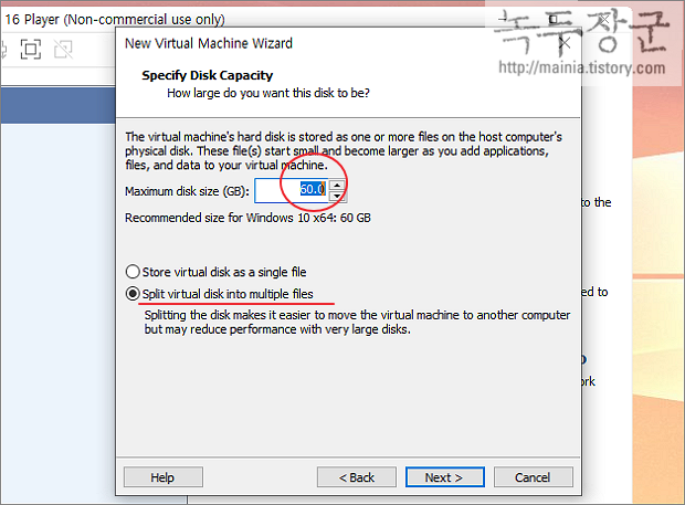 ▼ 세 번째에서는 가상 머신의 최대 디스크 크기를 지정합니다. 만약 사용하다고 공간이 부족하면 어떻게 해야 할까요? 가상 머신 설정에서 크기를 변경할 수 있으므로 사이즈는 대충 입력합니다.