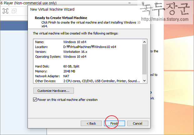 ▼ 마지막으로 구매하지 않은 무료 버전이므로 Use VMWare Workstation 16 player for free for non-commercial use 를 체크하고 설치를 진행합니다.