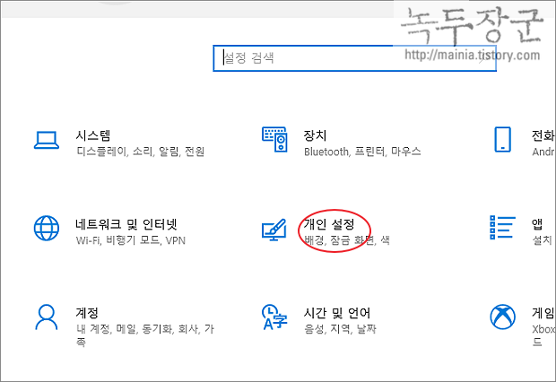 ▼ 윈도우에서 배경색을 변경하기 위해서는 개인 설정으로 가야합니다. 설정 > 개인 설정 메뉴를 클릭합니다.