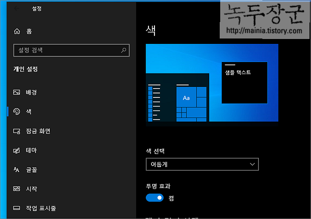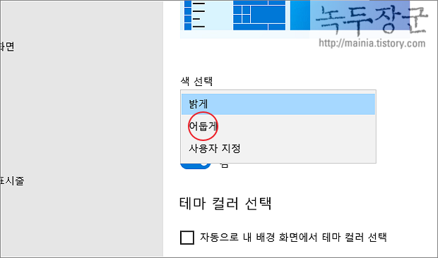 ▼ 여러 옵션 중에서 색 선택 항목을 클릭해 보세요. 크게 윈도우 색을 변경하는 옵션은 3가지입니다. 다크모드 설정을 위해서 어둡게 를 선택합니다.