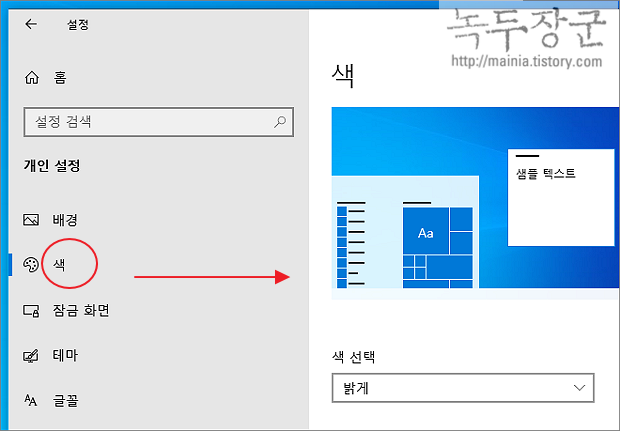 ▼ 개인 설정 화면에서 왼쪽 사이드에 색 메뉴를 선택하고 오른쪽 화면으로 이동합니다.