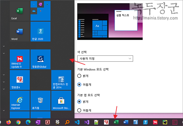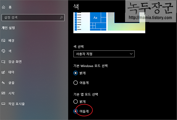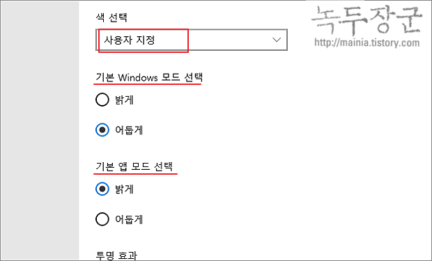 ▼ 미리보기에서도 확인할 수 있지만 첫 번째 그룹인 "기본 Windows 모드 선택" 은 시작 화면과 탐색기 같은 영역의 색을 어둡거나 밝게 변경합니다.