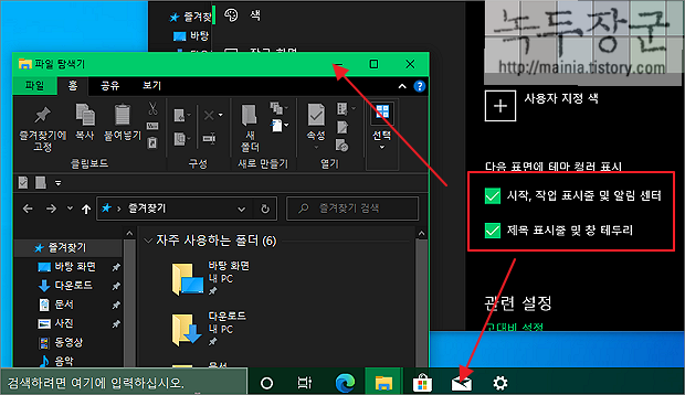 ▼ 좀더 아래로 내려가면 다음 표면에 테마 컬러 표시 항목이 있습니다. 아래 두 가지 영역에만 테마 컬러 지정이 가능합니다. 컬러를 선택하고 체크를 해 보세요. 해당 부위의 색상이 변경되는 것을 알 수 있습니다.