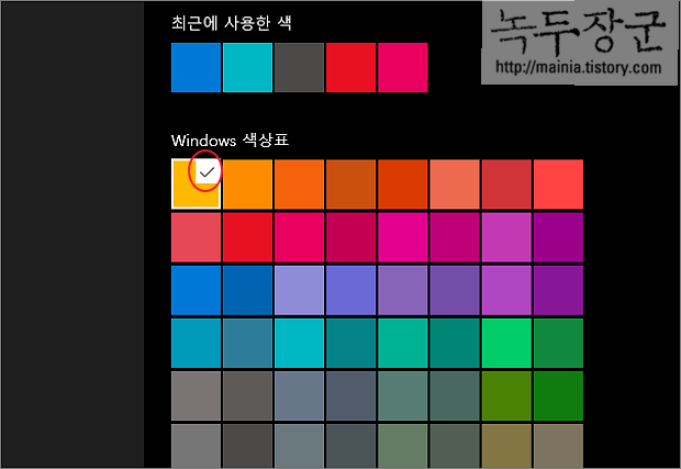 ▼ 참고로 한가지 더 설명하겠습니다. 색 선택 아래에 보시면 사용자가 선택가능한 색상 표를 제공합니다. 이것은 테마 컬러로 배경색을 지정할 때 사용하는 것이 아닙니다.