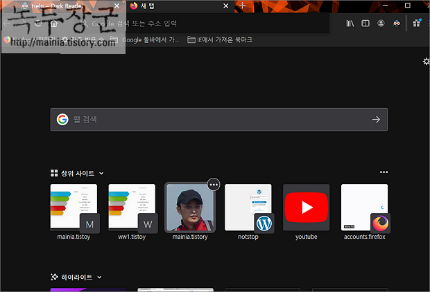 ▼ 설치와 동시에 다크모드가 적용됩니다. 새 탭을 생성해 보세요. 그림처럼 배경이 배경과 URL 검색란과 테두리가 모두 검은색으로 바뀌었습니다.