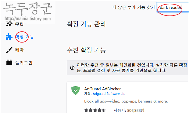 ▼ 부가 기능 설정 페이지에서 확장 기능 페이지로 이동합니다. 제가 추천하는 다크모드 확장 프로그램은 Dark Reader 입니다. 검색 기능을 이용해서 프로그램을 찾습니다.