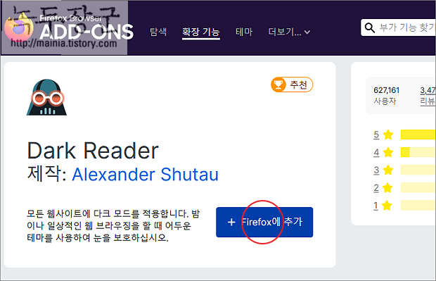 ▼ 확장 기능 상세 페이지에서 Firefox 에 추가 버튼을 눌러 설치를 진행합니다.