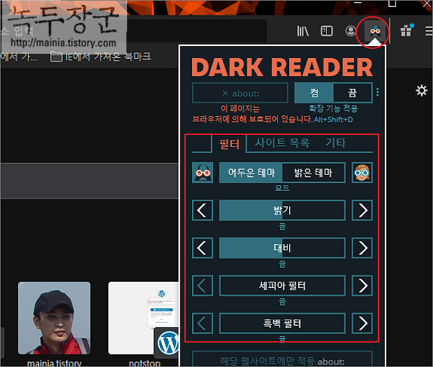 ▼ 다크모드 기능을 제거하는 Dark Reader 아이콘을 클릭해 보세요. 아래 제공하는 옵션을 이용해서 밝기와 글자들의 대비 정도를 조절할 수 있습니다. 그리고 상단 끔/켬 을 눌러 다크모드 기능을 제어합니다.