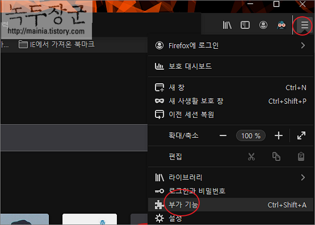 ▼ 먼저 다크모드 전환을 위해 확장 프로그램을 다운받아 설치하겠습니다. 파이어폭스를 실행하고 오른쪽 상단 더보기 > 부가 기능 메뉴를 선택합니다.