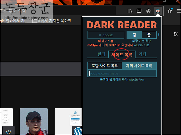▼ 두 번째 탭인 사이트 목록에서는 다크모드로 보기 불편한 곳들이 있습니다. 해당 사이트의 URL 을 입력해서 제외 혹은 포함시킬 수 있습니다.